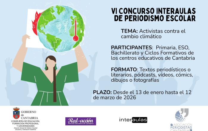 La Asociación de Periodistas de Cantabria y la Consejería de Educación convocan, a través del Proyecto InterAulas, la sexta edición de su concurso de periodismo escolar. En esta ocasión, el alumnado de Educación Primaria, Educación Secundaria Obligatoria, Bachillerato y Ciclos Formativos de centros educativos de Cantabria deberá abordar el tema ‘Activistas contra el cambio climático’. El plazo de admisión de textos, pódcast, vídeos, fotografías, dibujos y cómics finalizará el 12 de marzo de 2026.
