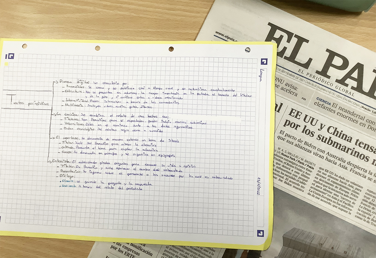 ¿Qué significa “editorial” en un periódico? ¿Qué importancia tiene una noticia “a cinco columnas”? ¿Vale lo mismo la publicidad en una página impar que en una par? ¿Las esquelas se cobran? ¿Qué tipo de páginas o suplementos van en color salmón? ¿Quién puede escribir una “carta al director”? En la clase de Lengua castellana y Literatura de 3º ESO se han analizado ediciones de prensa en papel de tirada regional y nacional.