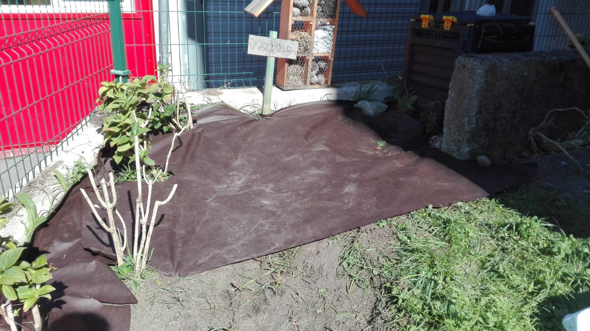 Parte del huerto ecológico con el Hotel de Bichos al fondo de la imagen.