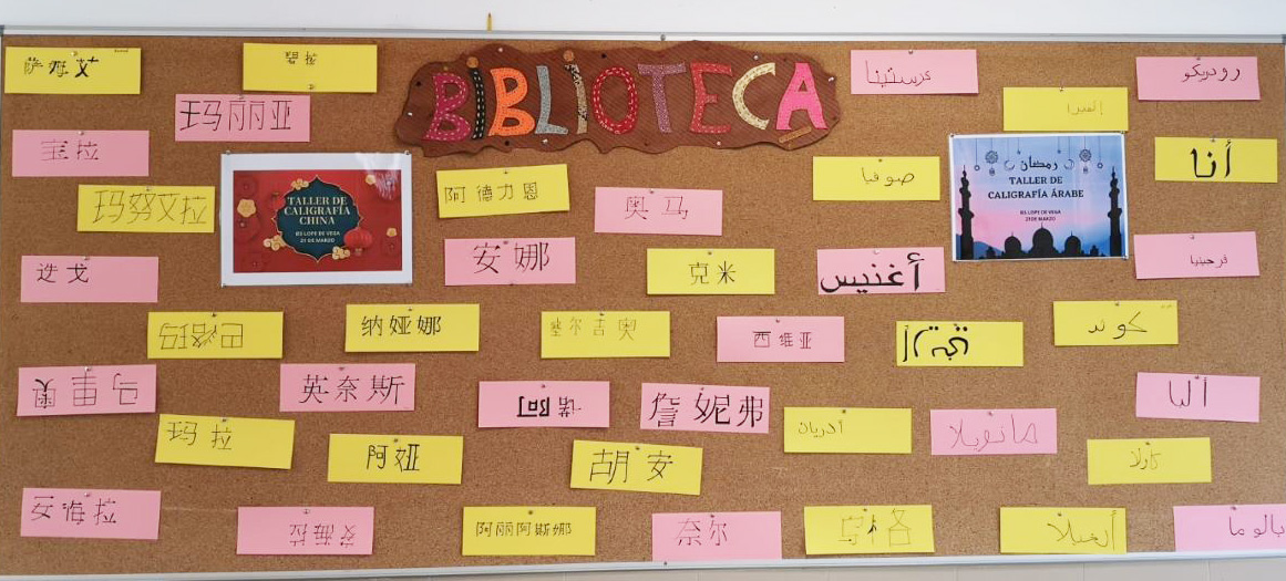 Durante los dos recreos se organizaron talleres de caligrafía china y árabe. Para ello, se contó con la colaboración estrecha de las profesionales ALO del centro, quienes tradujeron los nombres del alumnado y profesorado inscrito en los talleres. Además, el alumnado marroquí y chino colaboró con los participantes resolviendo dudas, explicando detalles curiosos de sus lenguas de origen y corrigiendo su escritura. Los participantes quedaron muy contentos con el resultado y pasaron un rato muy agradable acercándose a la cultura de sus compañeros y alumnos.