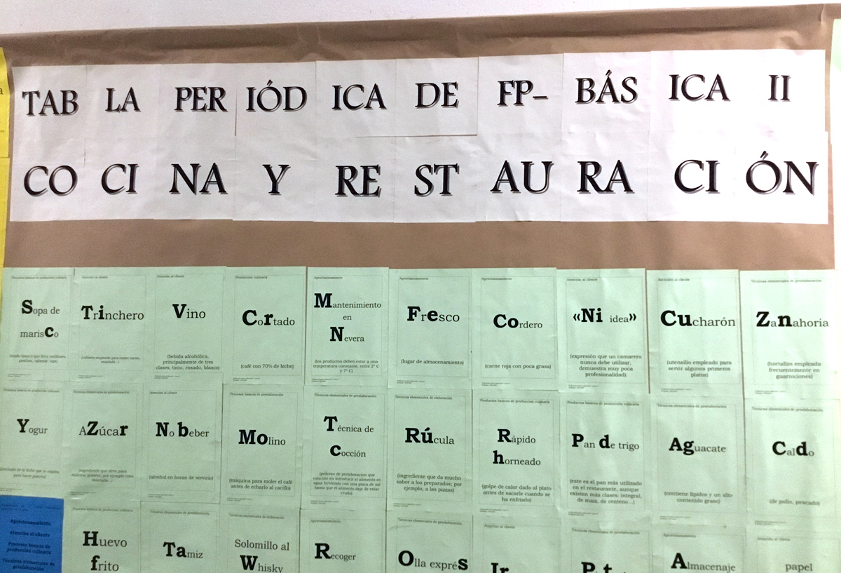 La clara de huevo se convierte en cloro, el vino en vanadio, el aguacate en plata y el cordero en cobalto gracias al trabajo realizado por estudiantes de 2º de Formación Profesional Básica de Cocina y Restauración del IES Besaya. El proyecto que han realizado consiste en utilizar las nociones aprendidas en el aula y trasladarlas a un mural que simula una tabla periódica. El trabajo final se expone en un pasillo del centro educativo.