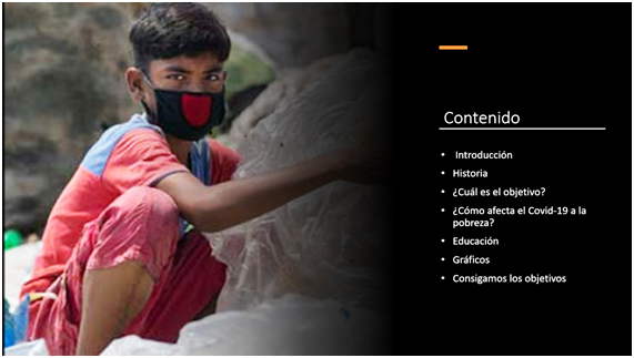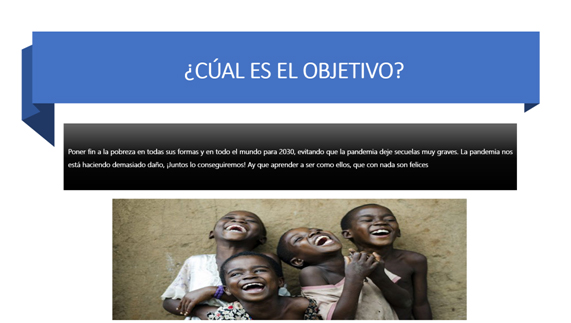 El trabajo presenta el objetivo número 1 a través de un póster en el que recogen datos estadísticos, consejos de elaboración propia para combatir la pobreza y reflexiones personales.