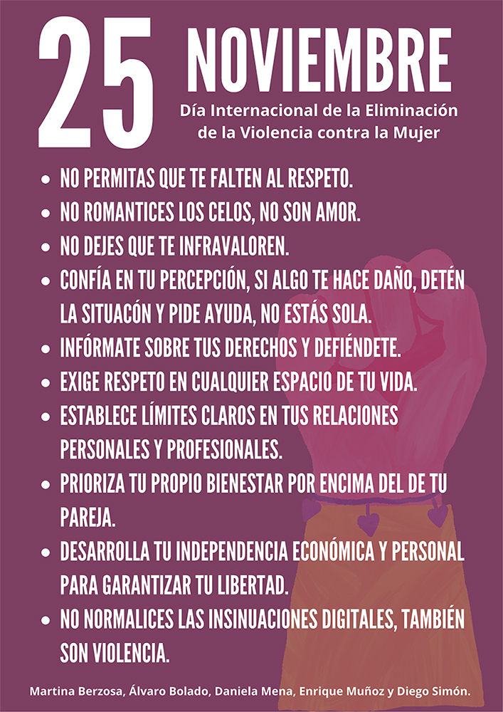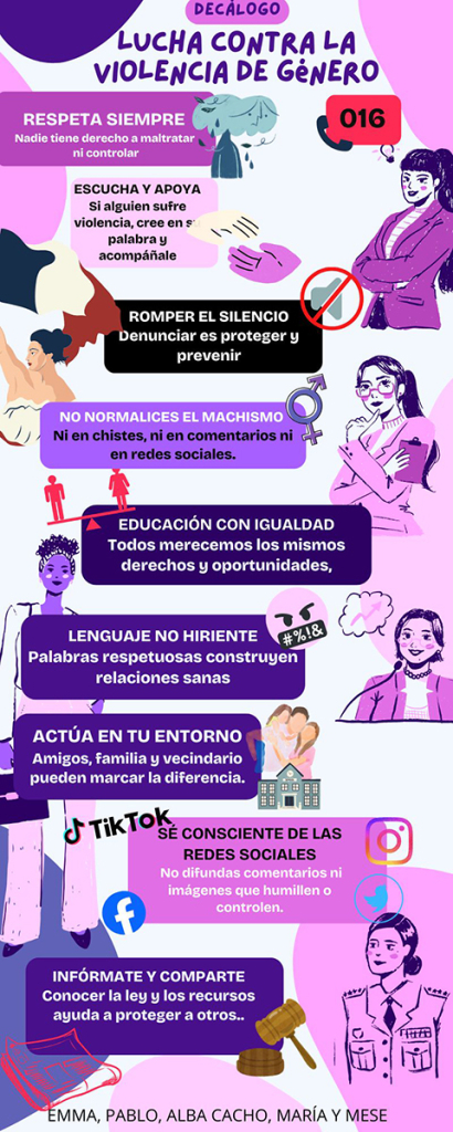 En el IES Valle de Camargo, como cada curso escolar, coincidiendo con el 25N dedicamos un par de jornadas a sensibilizarnos sobre la violencia machista: “La forma de brutalidad más extendida y frecuente a escala mundial tiene consecuencias devastadoras tanto para las víctimas como para la sociedad en su conjunto”. Este curso, la propuesta ha sido, después de unos momentos de lectura, reflexión y concienciación, escribir un decálogo por grupos.