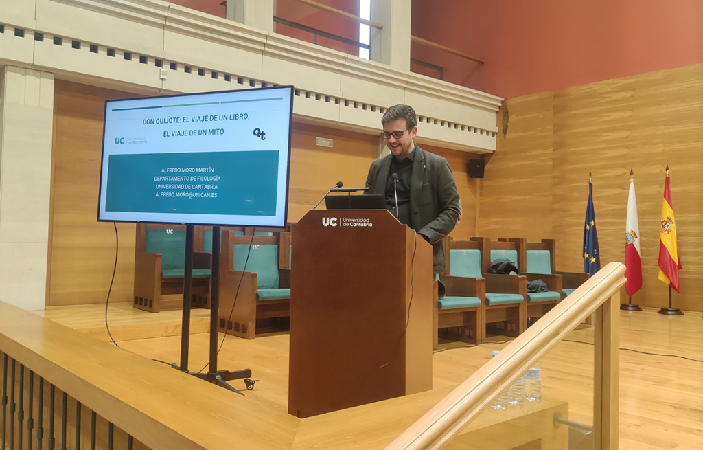 El profesor de la Universidad de Cantabria Alfredo Moro abrió el acto celebrado en el Paraninfo con la conferencia ‘Don Quijote: el viaje de un libro, el viaje de un mito’, en la que explicó la importancia de la obra de Cervantes y sus traducciones a más de 140 idiomas, incluida una en cántabro de 2017. Además, Moro repasó las múltiples versiones de la novela y sus adaptaciones cinematográficas o musicales, y recordó el proyecto ‘Quijote transnacional‘ en el que participa y que recoge todo lo referente al universo de la obra.