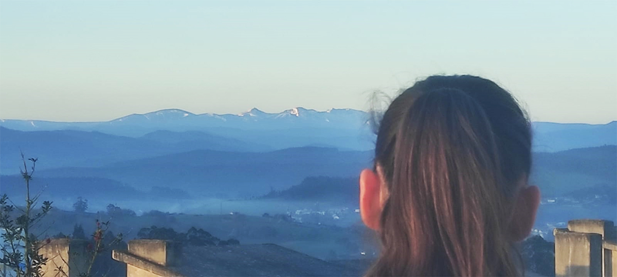 Sara mirando por una de las ventanas de su casa y contemplando montes y montañas en el horizonte.