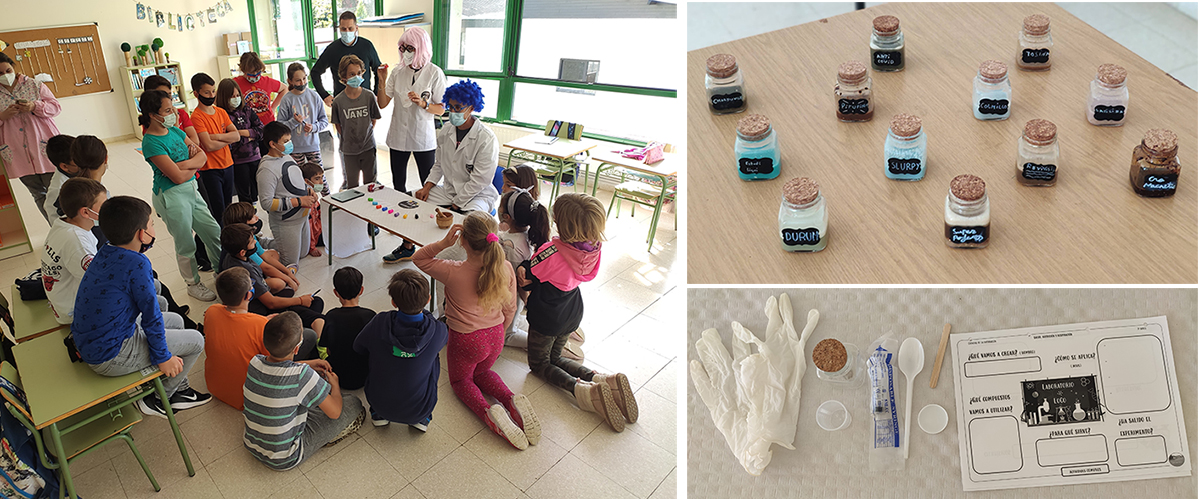 Los escolares, atentos a la explicación. A la derecha, resultado del experimento de las medicinas y los materiales usados.