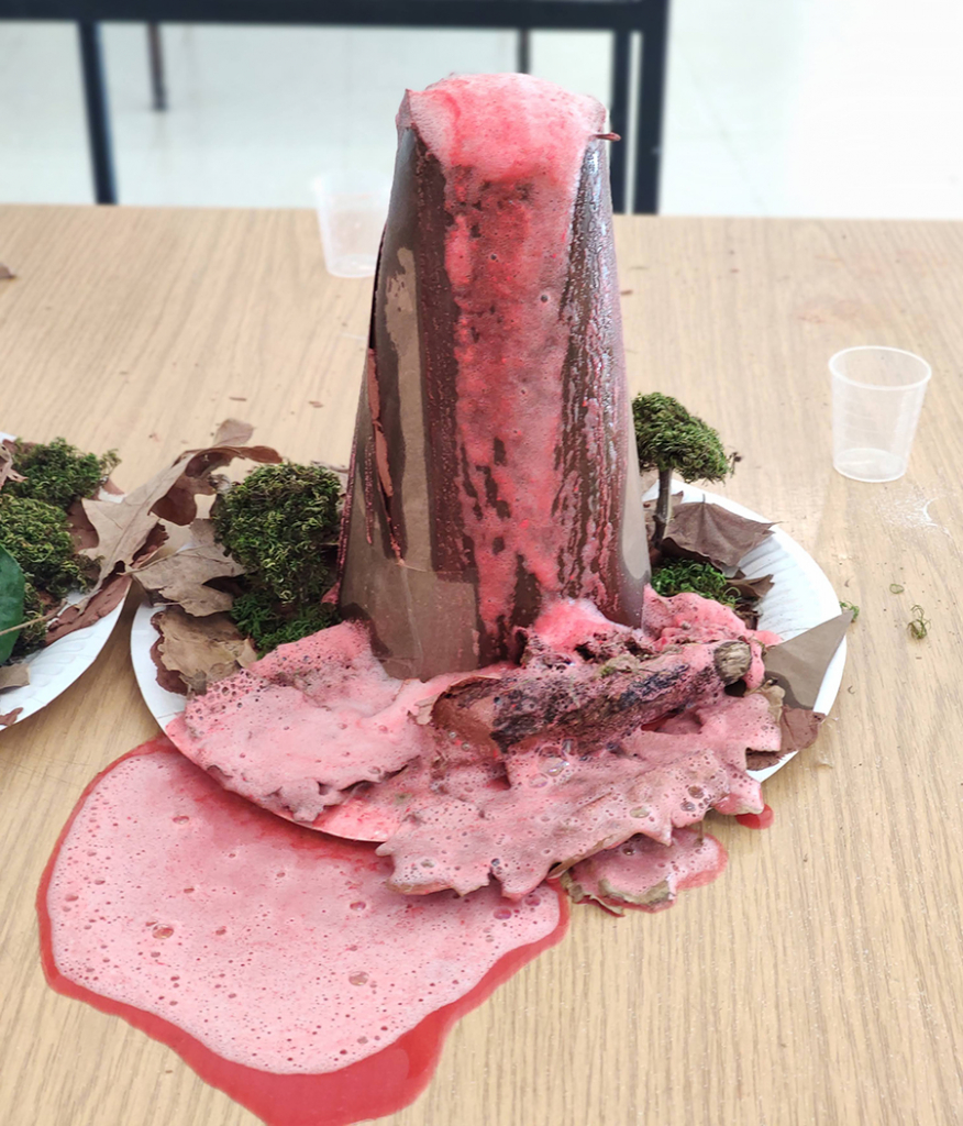 ¿En que consiste? Hemos hecho un volcán en clase que erupcionaba. Lo hicimos 3º, 4º, 5º y 6º, con Fran ruso y Sandra rusa.