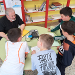 Uno de los alumnos lee a su clase la historia que ha escrito.
