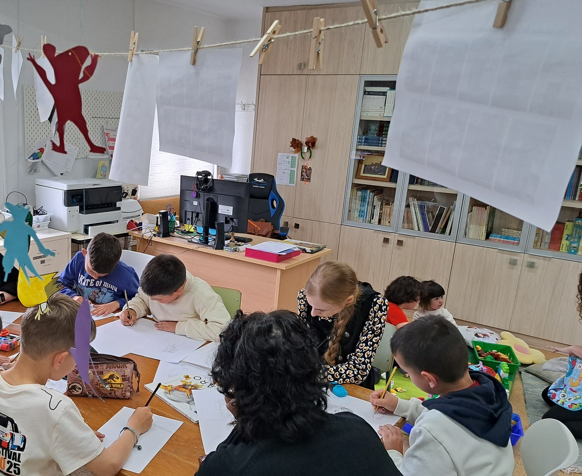 Desde las 9.30 h hasta las 10.30 h, en el rincón de la biblioteca, los alumnos de Primaria estuvieron conversando con ellas y haciéndoles preguntas sobre su trabajo y sus libros, que habían preparado previamente. Después, hicieron un taller de ilustración en el que dibujaron personajes inventados para hacer un móvil y luego celebraron un almuerzo especial para todos con frambuesas, cerezas, fresas, plátanos o galletas de mantequilla. Tras el desayuno, salieron a jugar al patio con las peonzas y al regresar a clase continuaron con otro taller donde las ilustradoras les enseñaron algunos trucos para dibujar retratos y perspectivas.